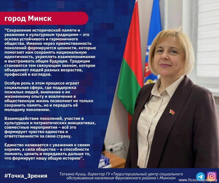 Татьяна Куиш, директор ГУ «Территориальный центр социального обслуживания населения Фрунзенского района г.Минска», поделилась мнением на тему «Единство в традициях, сила в памяти».